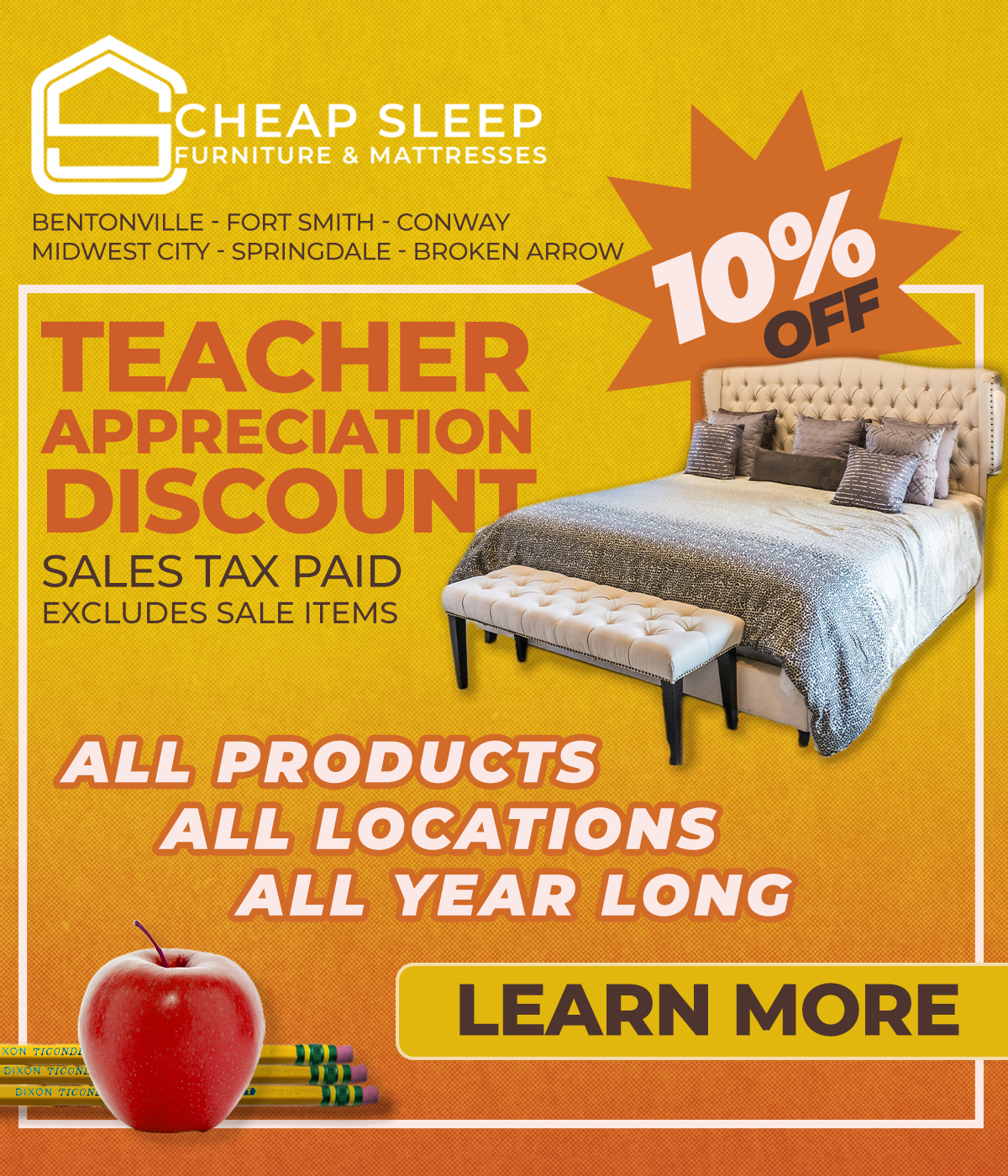 Cheap Sleep Mattress Firm tasked me with designing three variations on a social media ad that would help target and inform their audience of the store’s “Teacher Appreciation Discount.”